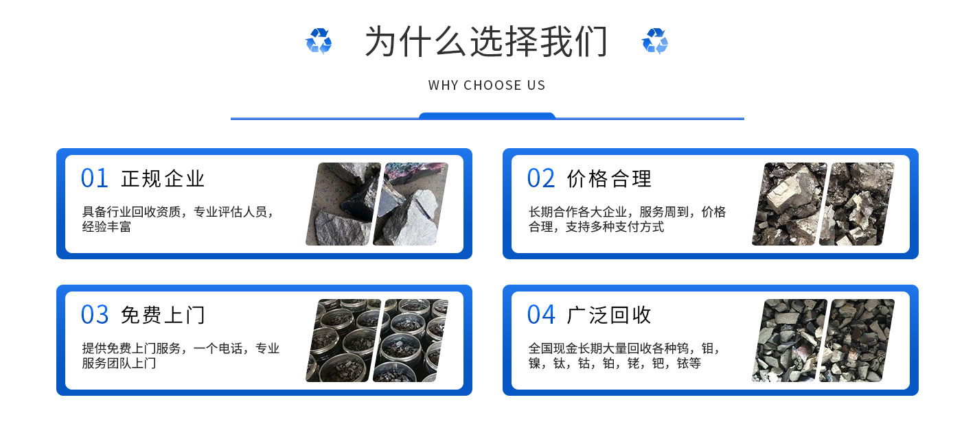 全国现金长期大量回收各种钨,钼,镍,钛,钴,铂,铑,钯,铱,铼,铟,镓,锡,钽,铌,铪,锗,铽,水银(汞)氧化铽,金属铽,氧化铽,镝铁,镨钕,氧化镨钕,各种氧化镓,金属镓,金属钽粉,氧化钽粉,金属铪,氧化铪,结晶铪,铼片,铼条,银板,铂金板,镀铱镀铑过滤网子,铟片,铟丝,氧化铟,铟锭,钨钼边角料,钨钼汇合料,钨铜料,各种纯镍,杂镍,镍铜料,电子镍,钴板,钴粉,锡条,锡丝,含锡废料,锗片,纯锗镜,50~80含量钒铁,40~45~50~55~60含量钼铁,70~80含量钨铁,钒氮合金等工业废料。凭借先进的检测设备和严谨的工艺流程,我们确保镍资源的精准分类与高值化再生利用。